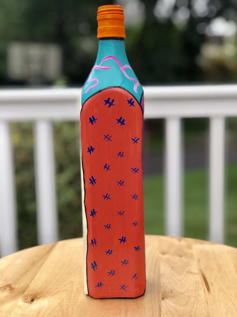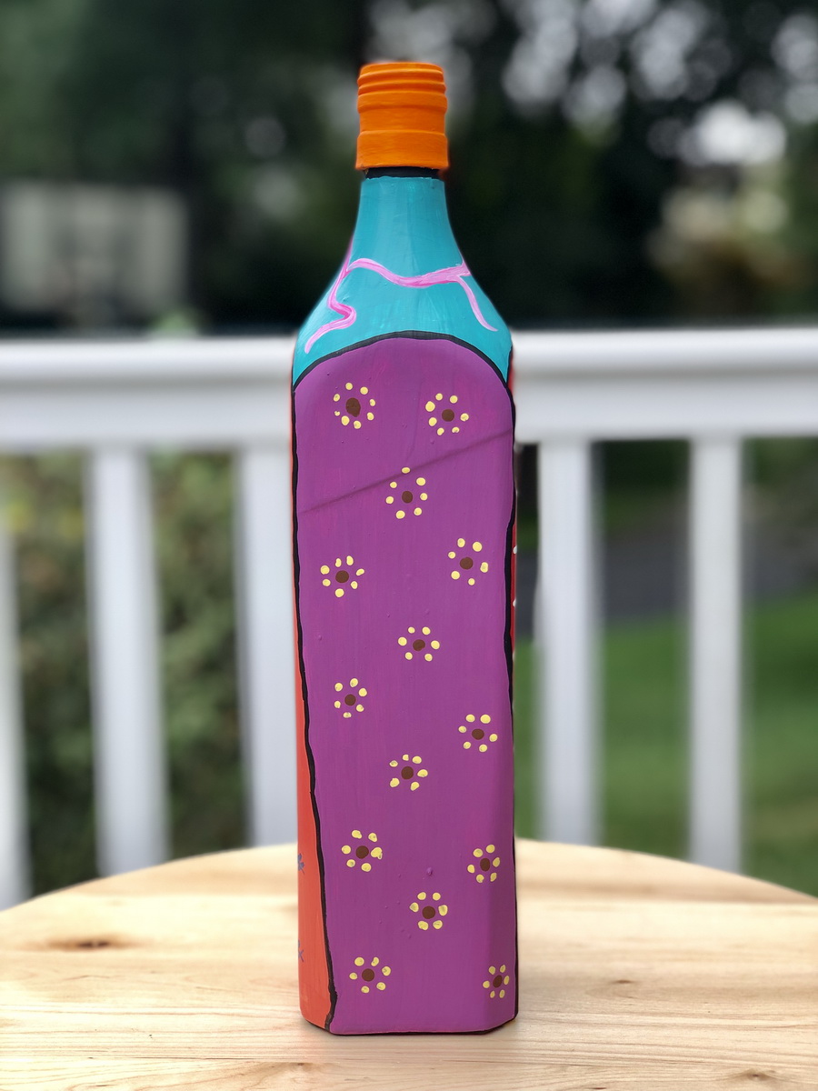 Recycled bottles and hand painted with acrylic paints