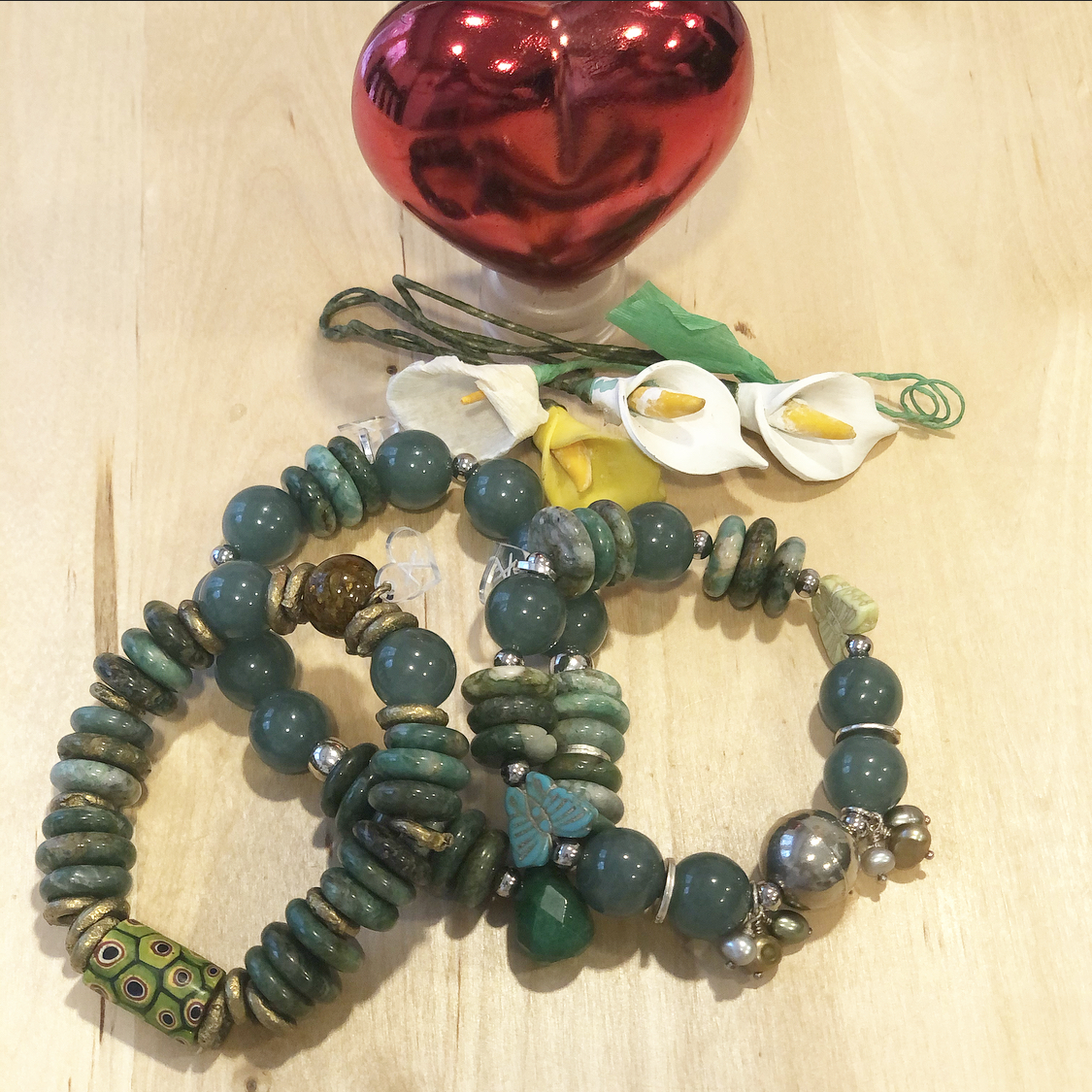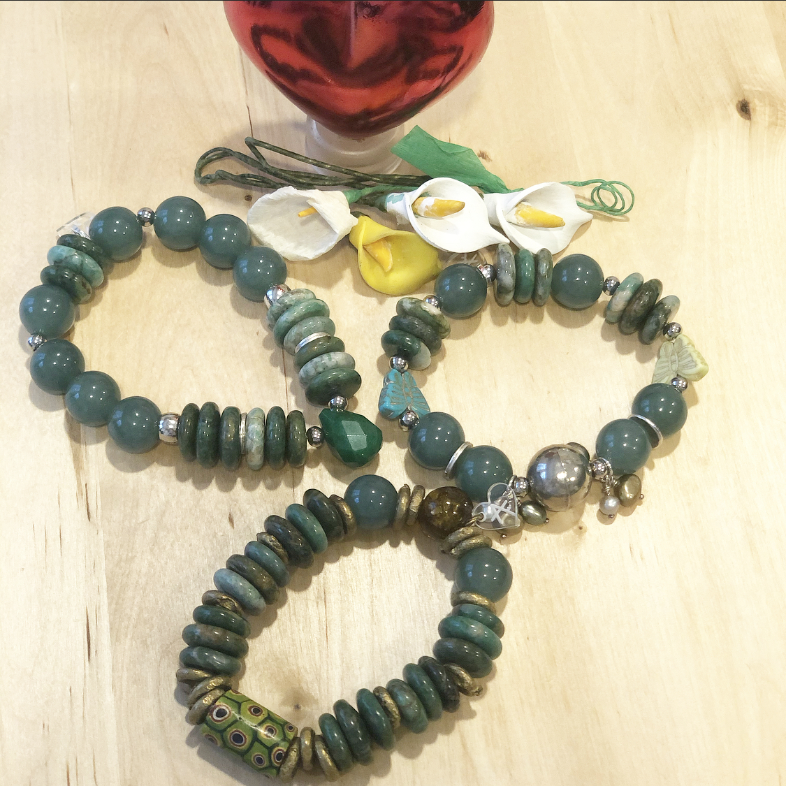Handmade bracelets with a combination of stones and metals that form unique pieces.
