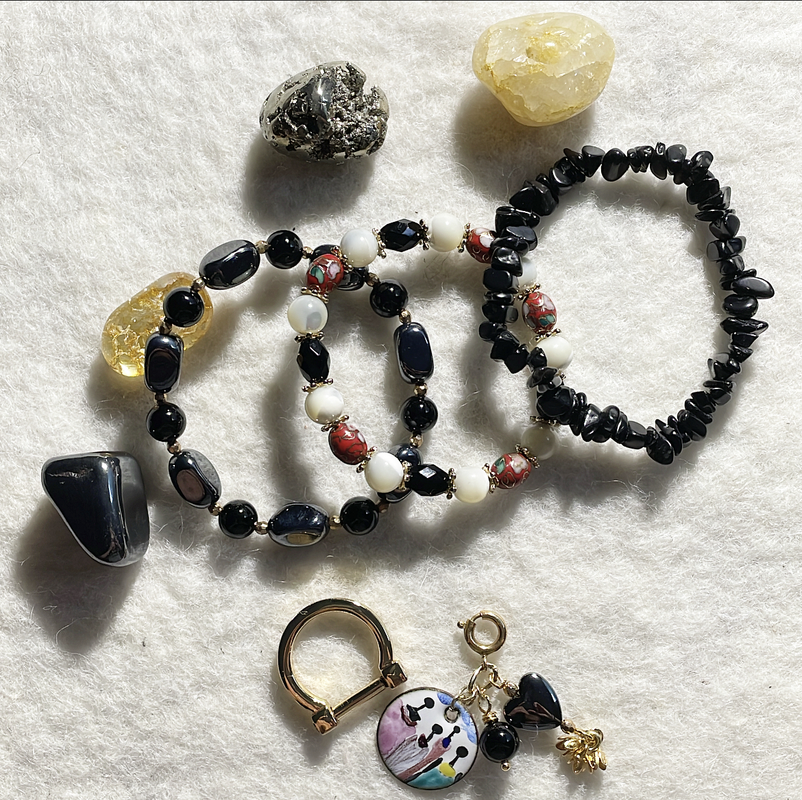 Handmade bracelets with a combination of stones and metals that form unique pieces.
